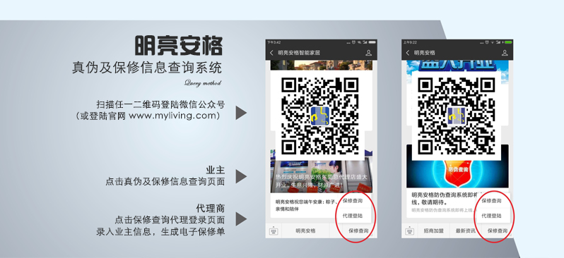 明亮安格公司緊跟時代發(fā)展,建立電子保修服務(wù)系統(tǒng),全國連網(wǎng)數(shù)據(jù)庫支持,正品保證,手機(jī)上即時錄入與查詢,讓安裝信息一目了然,可以為客戶提供更優(yōu)質(zhì)服務(wù)的同時,使客戶更有歸屬感,信任感。